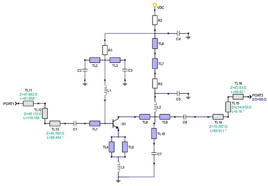In order to improve the overall performance of the amplifier, additional microstrip elements for impedance matching are included in the input and output networks of the amplifier, as depicted in Figure 5, where the full initial schematic of the amplifier is replaced with a block with a typical triangle-shape pictogram symbol. The calculated impedance values of these elements are presented as the magnitude of the impedance |Z| in Ω and electrical length in deg. The respective calculations are made for a characteristic impedance of 50 Ω.