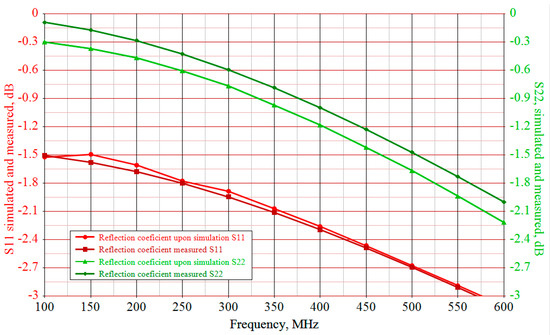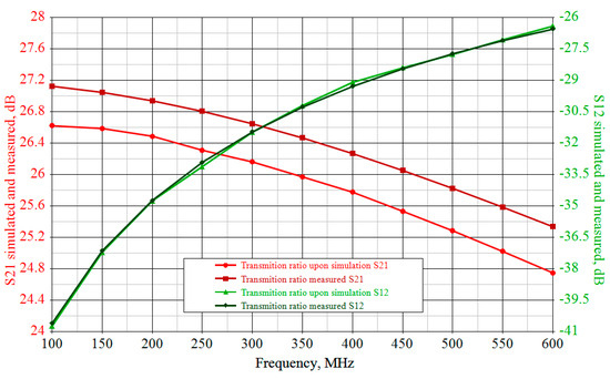 It can be seen that the simulated reverse transmission ratio S12 practically matches the measured values. The simulated forward transmission ratio S21 has more than 2 dB lower values than its measured values at the respective frequencies, although both curves “move” in parallel, keeping a constant value difference.