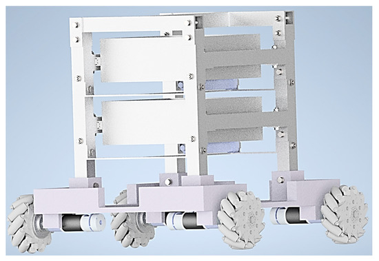 Regarding the structure of the robot, we have a solid monostructural bottom composed of a single element (Figure 6). This ensures the necessary strength, which is important, since it is the main support for the framework that is mounted on it. The necessary electronics are installed on the bottom as well. The skeleton of the robot is made of rods that are attached to each other by clamps and bolts, ensuring that the robot is easy to be manually assembled. The containers are mounted on the rails, which, in turn, are mounted on the horizontal bars that are part of the skeleton. They are driven by linear actuators located below them on elements that are intended to carry them. The actuators and the supporting structure are calculated so that the containers can store a load of up to 30 kg on each container. The skeleton of the robot ends with an H-shaped structure of the rod elements. It is calculated for it to be able to carry a load of about 20 kg and the robotic arm placed on top of it. The wheels, along with the electric motors, are under the bottom panel. The motors are capable of outrunning the robot at a nominal speed of 0.3 m/s. The robot is mainly made of aluminum, which guarantees the necessary strength and weight. The robot weighs around 80 kg and is designed to carry a robotic arm weighing around 20 kg. Fully assembled, its carrying capacity is about 40 kg.