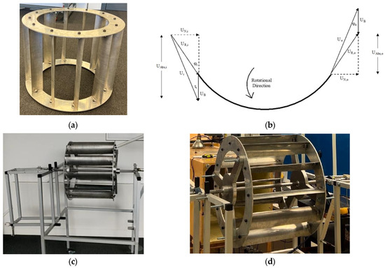 A bespoke test facility was developed in order to achieve the objectives of this study. The test facility consisted of a 1:2.5-scale model of a 12-bladed VAWT and its support structure. The full-scale VAWT was numerically investigated for its steady and transient performance in a number of published studies [6,7]. For experimentation purposes, as we were restricted by the cross-section of the wind tunnel (450 mm × 450 mm), the height of the VAWT was 400 mm, while its inner and outer diameters were 400 mm and 560 mm, respectively. The VAWT was fabricated in-house using 1.6 mm thick cold-rolled aluminum sheets and is shown in Figure 1a. The blades were aerodynamically designed based on velocity triangles as shown in Figure 1b. The portable support structure of the VAWT was made of hollow square aluminum sections of 20 mm × 20 mm and is shown in Figure 1c. A rotary encoder (far right of Figure 1d) was utilized to measure the angular position of the VAWT, exhibiting a frequency of 10 Hz. The encoder was connected to a PC with software installed to record the angular position data with respect to time. The accuracy in measuring the time and angular position of the shaft was 100 ms and 0.05°, respectively. A wind speed of 6 m/s, which is Aberdeen’s average wind speed, was set in the wind tunnel. As for the experimental procedure, the VAWT was held in-place until the desired wind speed was attained from the wind tunnel and verified using a digital manometer. Following this, the VAWT was set free to gain angular momentum until a steady rotational velocity was attained.