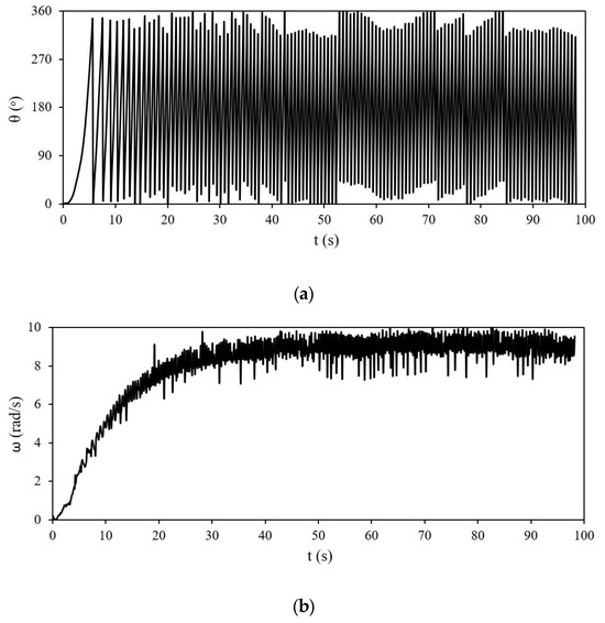 Experimentally recorded data: (a) angular position; (b) rotational speed of the multibladed VAWT.