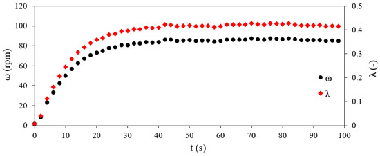 Further analyzing the experimentally recorded data, the angular velocity (ω) in rpm and the tip speed ratio (λ) were calculated. In order to smooth out the data shown in Figure 2b, a moving average window of 20 counts was used, and the results obtained are shown in Figure 3. It can be seen that the multibladed VAWT reaches a peak angular velocity of 85 rpm in about 30 s. During the startup of the VAWT, the tip speed ratio continues increasing until a peak tip speed ratio of 0.42 is achieved. This clearly indicates that the startup of drag-based VAWTs comprises two stages, i.e., an initial acceleration followed by a plateau region (steady operation). Published studies using numerical methods [6,7] have predicted operational tip speed ratios of 0.33 for the same multibladed VAWT design; however, the experimental investigations of this study clearly show that the actual operational tip speed ratio is 0.42. As the numerical studies are based on a number of assumptions and simplifications like perfectly smooth blades and turbulence modeling, the results presented in this study should be used for calculating the power output and LCOE from multibladed VAWTs.