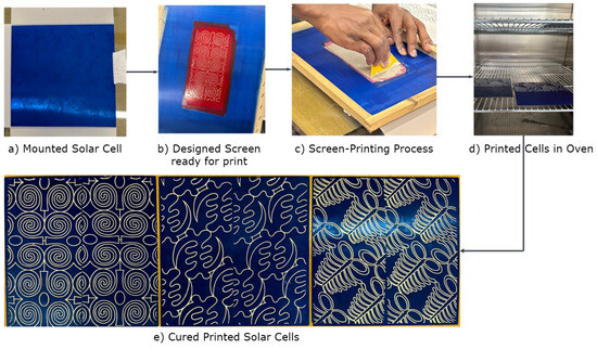The process involves tightly stretching the organdie fine mesh onto a wooden or metal frame, after which a stencil is created. Stencils can be created from a wide range of approaches and materials. These include fabric, stencil paper and greasy paint. Stencils can be applied on a screen in diverse ways. For instance, they can be placed directly under the screen for printing or transfer the design onto the screen by using a photo-sensitive paint. Once the design has been transferred, the squeegee can be used to force the ink through the mesh onto the substrate. Key stages of screen-printing include the organisation of general materials, pattern creation, conductive paste preparation, substrate preparation, curing, and cell characterisation.