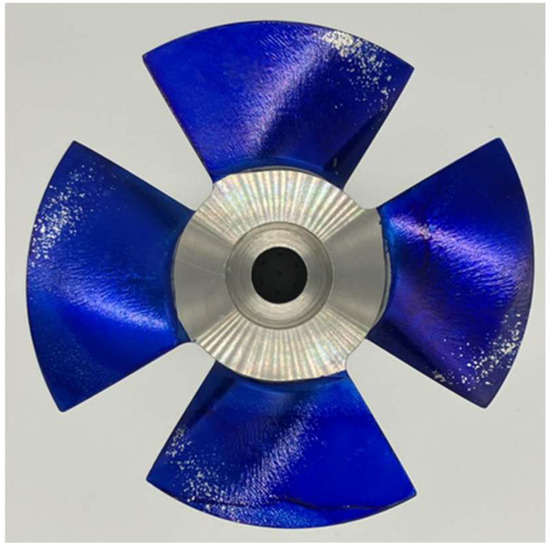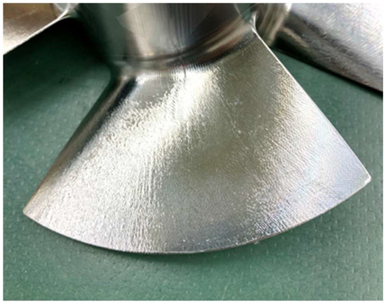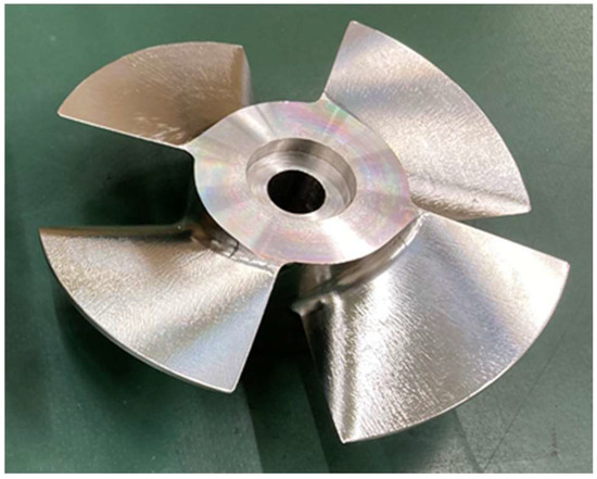 The test model is an axial-flow impeller called a fan-type inducer, which is used in industrial centrifugal pumps. The impeller outline is shown in Figure 1, and the primary dimensions are listed in Table 1. Fabrication is conducted using a hybrid system of WAAM and machining [9]. As shown in Figure 2, a round bar was used as the base material, laminating the near-net blades using WAAM. As shown in Figure 3, after being laminated by WAAM, the impeller was machined into the designed shape. In this study, the evaluation was based on this fabrication time.