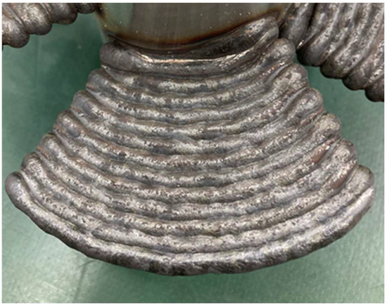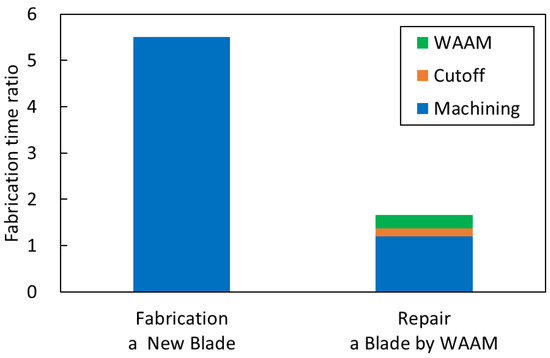 As a method of repairing the damaged area, the focus is on a method in which after cutting the damaged area, a near-net-shape vane corresponding to the cut area is reshaped by WAAM and finished by machining. Figure 7 presents an overview of the proposed repair method. To evaluate the usefulness of this repair method, an analysis of the fabrication time was conducted. In analyzing the fabrication time, the method for fabricating a blade shape from a round bar using only machining was used for comparison. The fabrication conditions for machining were the same as those in a previous study [9]. For example, for parts with a very small number of parts, such as one-of-a-kind items, fabrication by machining only is a common process in the industry. The results of comparing the fabrication time per blade are shown in Figure 8. The “Fabrication time ratio” on the vertical axis was calculated using the lamination time of a single near-net-shape blade by WAAM as 1. The application with WAAM achieves partial blade repair, which reduces the area to be finished by machining, resulting in a shorter fabrication time. Furthermore, even when including the time required for partial reshaping of near-net-shape blades by WAAM, the reduction in fabrication time is sufficient. In this case, the fabrication time was reduced by approximately 70% compared to the traditional process. Future work will include analyses of blade shapes and materials [12]. In addition, cost analysis and experimental evaluations are also necessary to clarify the industrial value of the process.