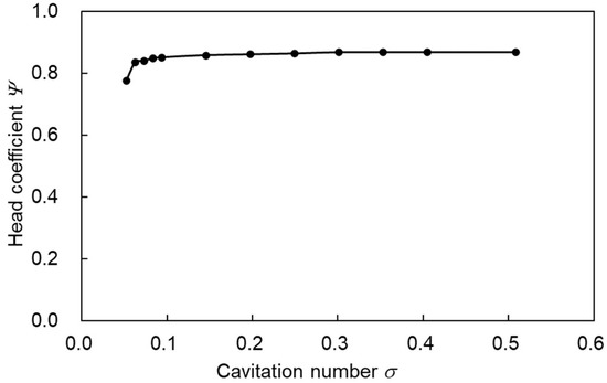 The NPSH test results are shown in Figure 4. The definitions of head coefficient Ψ and cavitation number σ are given in Equations (1) and (2).
