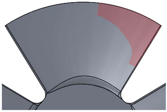 A decrease in the head coefficient can be observed by a lower cavitation number. This is due to the lower cavitation number, which leads to more cavitation development. As an example of the paint erosion test results, the appearance of the inducer after operation at cavitation number σ = 0.094 is shown in Figure 5. Figure 5 shows that although the degree of blue varnish peeling varies among the four blades, they are almost identical in terms of the peeling area. This trend is similar for other cavitation numbers σ. The blue varnish peeling occurs only on the negative pressure side and is not observed on the positive pressure side. The blue varnish peeling areas obtained in all paint erosion tests are summarized in the red region in Figure 6. Therefore, the red region in Figure 6 represents the area of the blades damaged by cavitation erosion.