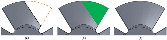 Blade repair using WAAM: (a) cutoff cavitation erosion area (orange area); (b) fabrication of near-net-shape cutoff area using WAAM (green area); (c) finishing of the work.