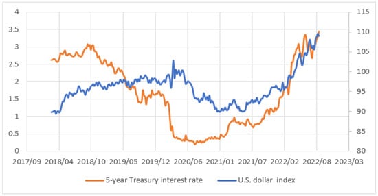 Weekly price trends of the US dollar index and 5-year Treasury interest rate.