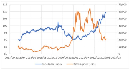 Figure 1 illustrates that the US dollar index rises with interest rates. Figure 2 demonstrates that since 2021, Bitcoin’s price has fallen, whereas the US dollar index has risen. Such changes have influenced the competition between cryptocurrencies and traditional currencies in the monetary policy of the US Federal Reserve. During periods of high inflation, demand increases for immediate payments, and consumers may prefer traditional currencies over cryptocurrencies, thereby strengthening the US dollar. Additionally, rising interest rates favor the US dollar; one disadvantage of Bitcoin is that it does not generate interest income.