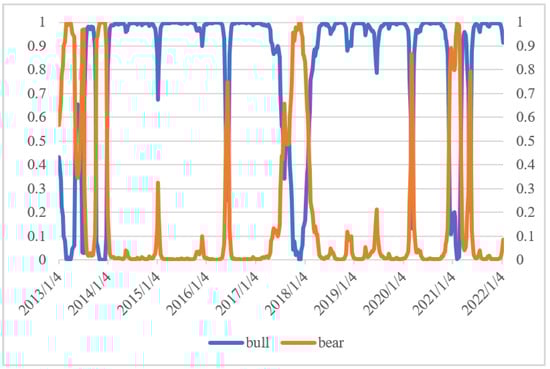 Figure 3 shows the long–short cycle of BTC, with the blue line representing the bull market and the orange line representing the bear market. For the models, and μ2 was 0.091 (Table 1). Even in the bear market, the price of Bitcoin was still in an upward trend. The duration of Model I in Table 1 was 40.357 in the bull market and 8.409 in the bear market, indicating that Bitcoin will be in the bull market most of the time from 2018 to 2022. In addition, the coefficients of XVIX and XUS in Model II and Model III were negative, indicating that the rise of VIX and US caused BTC to fall, and the effect of USD against Bitcoin impacted that of VIX on Bitcoin. The bear market duration affected Model III more than Model I. However, the same phenomenon appeared in the bull market, indicating that adding the dollar factor causes Bitcoin’s cycle to change from a short cycle to a longer cycle.