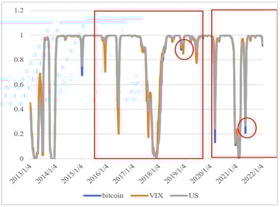 Figure 4 shows the cyclical patterns of VIX, US, and BTC. The gray line is for US, the blue line represents BTC, and the orange line is for VIX. As shown in Figure 2, VIX affected the structural transformation of BTC from 2016 to 2020, but in 2021, the US affected the structural transformation of BTC. VIX significantly impacted BTC during the epidemic, especially in early 2020. However, in early 2021, the U.S. Federal Reserve’s monetary policy impacted the global financial market and strengthened the US’s structural transformation of BTC. This result is in line with expectations.
