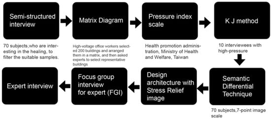 In past research, we used experimental methods to obtain the subject’s views on the decompression structure to obtain the participants’ feelings. Therefore, in this study, we used the same research method to examine the impact of the quantity of building materials on high-stress people. For each of the 70 participants, we analyzed their perceptions of stress relief and pressure and investigated how each perception was related to previous and subsequent thoughts and external stimuli. The decompression index of 30 buildings was evaluated through the Decompression Building Scale.