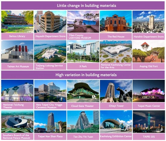 We obtained the subject’s views and feelings on the decompression structure by collecting data on buildings with Taiwanese cultural characteristics for investigation (Figure 2). Each participant was assigned to observe two types of buildings (buildings with more than three materials and less than three materials). Participants chose one of three constructive conditions including (1) no stimuli available (after observation, participants were given only a brief overview of the building’s design, e.g., location, building name, and designer’s name), (2) restricted access to stimuli (participants have access to the stimulus search tool, but only once per session, i.e., using web pages to retrieve material), and (3) unlimited access to stimuli (we used the search tool multiple times within the access time limit). Then, we studied the stress-relieving architectural choices for the participants. We asked for the judgment of the participants in a short period to obtain the true feelings of the participants
