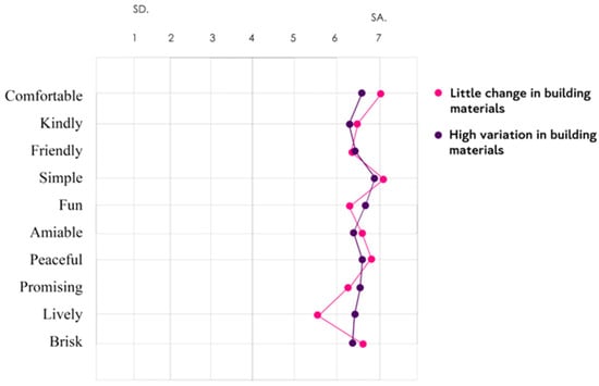 This study was conducted based on the experience of the participants and their perceptions of building materials. The findings in this study suggested that buildings with excessive decoration and detail are fascinating but cause stress. Too many decorations on buildings overwhelm people with excessive information. Thus, multi-feature visual complexity is required for urban renewal. For instance, when renewing historical streetscapes, the principle of preserving urban memory is required. Instead of reproducing each element in an imitative manner, multi-feature visual complexity is used for buildings, facilities, or furniture to maintain a similar level of complexity by using surface materials with similar textural complexity. It is important to consider the residents’ well-being. In the past, urban architecture was often developed solely according to the designer’s aesthetics but emphasis was put on functionality and livability recently. It is necessary to include more designs and materials. The building must be isolated from its environment to conduct more organized experiments. We used software to remove things other than buildings in images. The participants were influenced by environmental impressions when judging materials were changed. Therefore, they had different opinions based on their imaginations. However, it was still possible to examine the stress-relieving building’s materials. That is, individuals’ judgments of material changes depended in part on their mood. There are various emotions involved in these judgments being affected by changes in the environment.