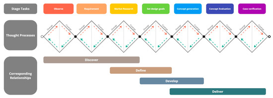 For the foundational design flow, we developed the stages of dispersion, iterative computation, convergence, and delivery in design. At each stage, outputs were used as inputs. In this approach, we used a multi-diamond model and employed the methodology in Section 2 for the research, analysis, and evaluation of the model’s feasibility.