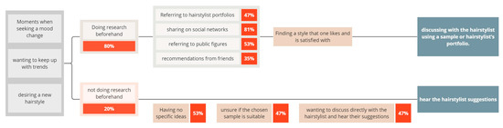 According to the survey results (Figure 6), 80% of the respondents conducted research before visiting a hair salon. The primary methods included using social media and referencing hairstylist portfolios. Approximately 20% did not perform pre-research due to a lack of ideas or a preference for direct communication with hairstylists. These findings represent the customer experience process before visiting a hair salon.