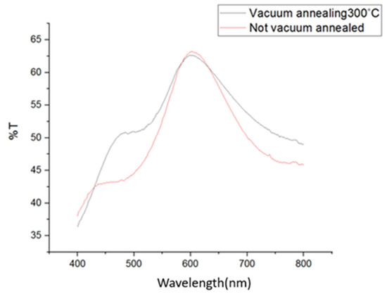 Visible light cross-transmittance of vacuum-annealed 300-degree Cu/AZO samples and unannealed Cu/AZO samples.