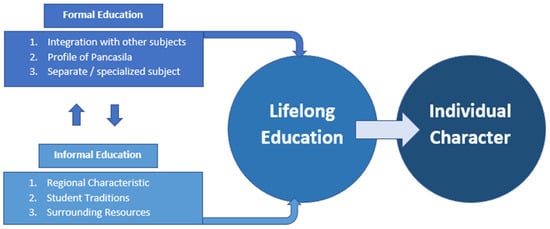 Lifelong education refers to an educational effort that lasts a lifetime to produce individuals to contribute to society. Lifelong education is carried out comprehensively at the formal and informal levels of education. Comprehensiveness means that education is a lifelong learning process for personal, social, and professional development [2]. The process of lifelong education has been improved based on the previous concept of education in two ways. First, the concept of lifelong education contradicts the belief that education is only limited to formal education, namely, schools and universities where both children and young people are prepared for adulthood. Second, the implication of applying this concept is that the formal education system must be regulated flexibly to accommodate individual choices and prepare young people to continue their education as self-directed and competent adult learners [3]. In lifelong education, two types of integration are needed, namely, horizontal integration and vertical integration. Horizontal integration brings all types of education that exist in society together, both in formal education, such as schools, and in informal education so that both can support each other. Furthermore, vertical integration refers to the continuity of each type of education available to each individual throughout their life [2].