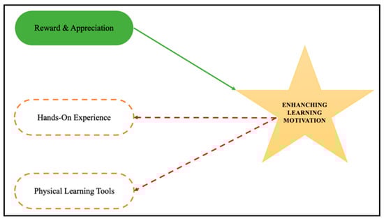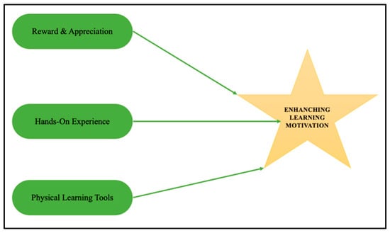 Figure 1 shows a summary of the interviews with children and parents of the control group who used magnetic boards. Three factors influenced the children’s motivation: rewards and appreciation, hands-on experience, and physical learning tools. “Reward and Appreciation” was the external motivation from the teacher (through ZOOM) and adult assistants through gifts, praise, and help. “Reward and Appreciation” contributed to increasing learning motivation. “Hands-On Experience” is a learning experience of children through physical touch in a project-based oriented activity. “Hands-On Experience” influenced the increase in learning motivation. “Hands-On Experience” was lacking in the control group. It did not increase the children’s learning motivation because they observed the computer screen operated by the teacher. Figure 2 shows the interview results for the experimental group showed that three factors, namely, “Reward and Appreciation”, “Hands-On Experience”, and “Physical Learning Tools”, increased learning motivation.