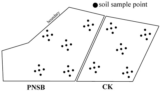 The sample analysis protocol was adapted from Ref. [10], where five sampling points were selected in each field, with four in the periphery and one in the center (Figure 1). Five samples were collected from each sampling point. To analyze organic carbon content in different soil layers, stainless steel soil core samplers were used to extract soil from three different depths (0–10, 10–20, and 20–30 cm). The samples were stored in individual low-density polyethylene (LDPE) plastic bags and transported to the laboratory.