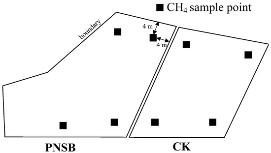 Gases from the experimental paddies were collected using a close chamber method during the period of rice cultivation. Samples were collected every two weeks, 5 times in total. Methane emissions were collected between 9:30 and 10:30 AM at four locations every 4 m (Figure 2) to obtain results that best correlated with overall emission levels [11]. We collected gas samples from the collection hoods placed horizontally on the field, and methane concentrations were measured at 0, 20, and 40 min after placement.
