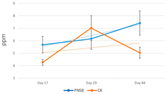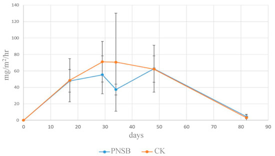The amount of emitted methane was measured on five days—17, 29, 34, 48, and 82 days after planting, respectively (Figure 4). During the initial phase of rice cultivation (0–17 days), the control and experimental groups did not exhibit significant differences in methane release. During the tillering phase (17–48 days), the amount of methane released gradually increased. We tallied the methane emissions during the period as a proxy of methane emissions across the entire second crop growth season. The control cohort released 49.48 ± 25.06 g-CH4/m2/season, while the PNSB cohort released 37.26 ± 12.97 g-CH4/m2/season. PNSB led to a 12.22 g-CH4/m2/season (122.2 Kg-CH4/ha/season) reduction in methane emissions, which is equivalent to 3.05 tons·CO2e/ha/season in terms of carbon dioxide equivalents.