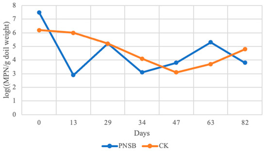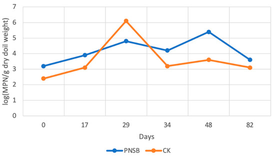PNSB content in water samples was measured using serial dilution followed by MPN. PNSB concentrations in water in the experimental group were higher than those in the control group (Figure 5). The addition of PNSB in this experiment increased the PNSB population size in water. On the contrary, soil PNSB concentrations were not correlated with the presence or absence of PNSB supplementation (Figure 6). Soil PNSB levels were higher during the first 45 days than later. Additionally, the concentrations of PNSB in water were positively correlated with the amount of dissolved oxygen (Figure 7). This indicated that a high PNSB concentration in water increased the amount of DO.