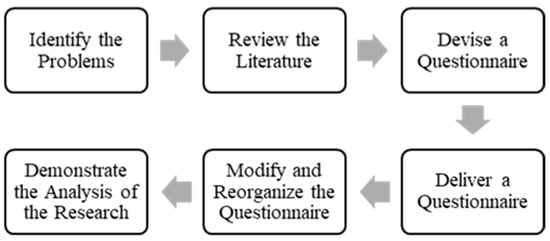 The research was conducted in the following six steps as depicted in Figure 1. First, we identified the problems. Second, the literature review was conducted. Third, a questionnaire was devised. Fourth, the questionnaire survey was conducted. Fifth, the questionnaire was modified for the survey (Figure 1).