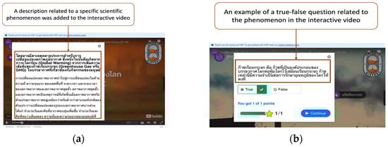 Interactive video generated by H5P: (a) text added to specific aspects of the video, (b) true–false question used for assessment.