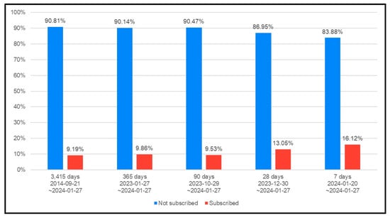 Ratio of subscribers for 7, 28, 90, 365, and 3415 days as of 27 January 2024.