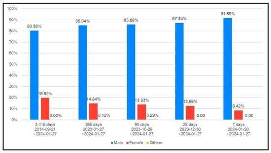 Gender ratio for 7, 28, 90, 365, and 3415 days as of 27 January 2024.