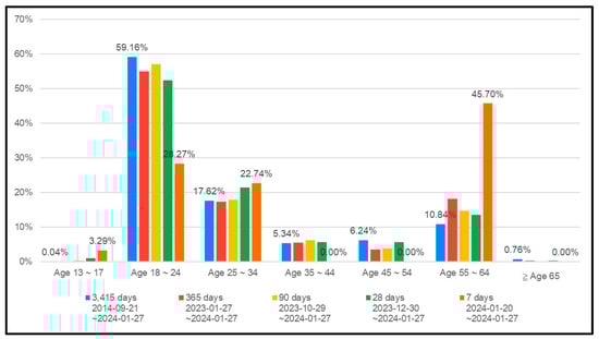 Figure 4 shows that the majority of viewers of the YouTube engineering mathematics channel were 18–24 years old from September 2014 to January 2024, accounting for 59.16%. The viewers were mostly college students studying engineering mathematics in this age group. Viewers over 35 years old accounted for 23.18%. During 20–27 January 2024, the dominant age group was 55–64 years old, constituting 45.70%. These results show the needs of both age groups. As engineering mathematics questions were explained for civil service exams with a proverb (Figure 5) bilingually, this addition attracted more viewers.
