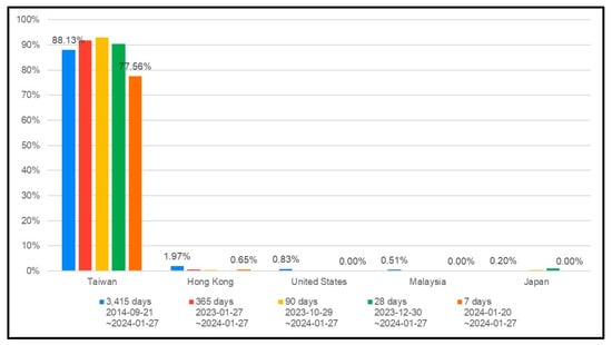 From September 2014 to January 2024, most viewers were from Taiwan (88.13%) and Hong Kong (1.97%). Thus, it was necessary to meet the needs of local students. On 20–27 January 2024, there was an increase in the proportion of self-learners from outside Taiwan. Consequently, it was needed to provide the video in a bilingual mode (Figure 6).