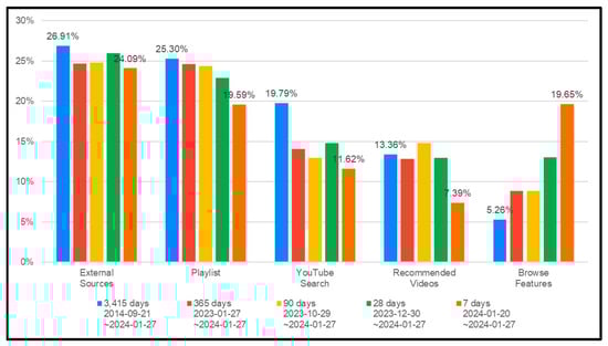 The data in Figure 7 shows that students learning engineering mathematics discover instructional videos on YouTube primarily through “External Sources” and “Playlist”, followed by “YouTube Search”, “Recommended Videos”, and “Browse Features”. The proportions of “External Sources” and “Playlist” were 26.91% and 25.30% from September 2014 to January 2024. “External Sources” were used for external websites or apps. During 20–27 January 2024, viewers browsed the videos as “Browse Features”. Traffic from “Browse Features” was generated through the homepage, subscription feed, watch later, trending, and explore sections of YouTube.
