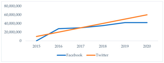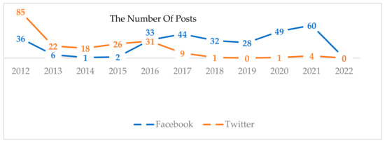 Mongolia’s adoption of digital diplomacy under President Khurelsukh Ukhanaa illustrates the potential of ICT in enhancing international relations, even among smaller nations [18,24]. Since joining social media in 2012, Ukhanaa has used these platforms sporadically, with notable increases in activity during certain years. His engagement has highlighted Mongolia’s stance on international issues, as evidenced by his congratulatory tweet to Prime Minister Modi on India’s vaccination milestone, which garnered significant attention. However, the engagement level of his accounts suggests room for increased consistency and broader strategic use of digital platforms. This is detailed in Figure 2, which shows the use of Facebook and Twitter by President Ukhanaa.