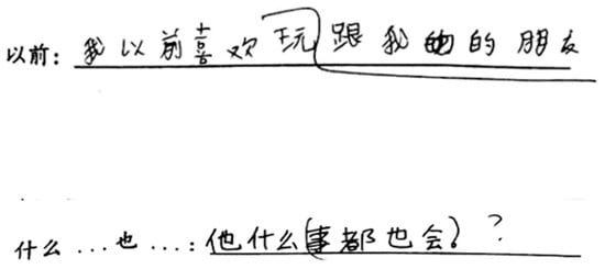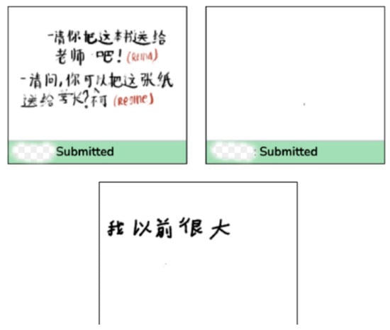 Errors were found in grammar, word order and syntax, and sentence meaning. Meanwhile, in writing words, errors occurred in using correct words. For example, mistakes in writing the word 吗 become 马, and 评 became 枰. Students were unable to write the Chinese characters, for example, the letters “蔬菜”, which were written as “shucai” (Figure 4).