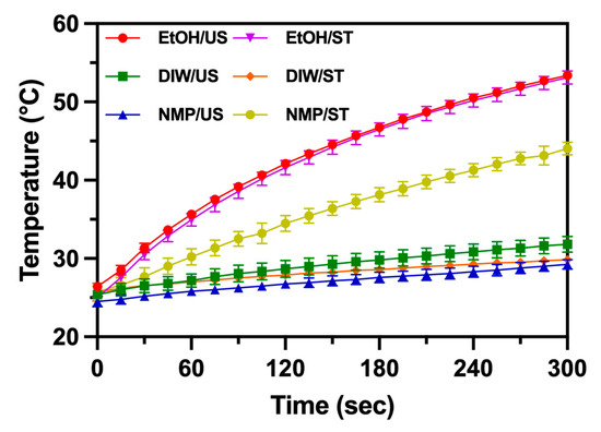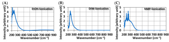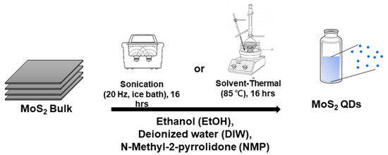 Commercially available MoS2 powders (~100–150 μm) were dispersed in ethanol (99.99%) by either ice-bath sonication (US) or solvent–thermal exfoliation (ST), as shown in Figure 1. Three solvents were used in this study: ethanol (EtOH), deionized water (DIW), and N-methyl-2-pyrrolidone (NMP). 20 mL of the solvents was used for the dispersion of MoS2 powders. Following the dispersion, the solutions were centrifuged at 10,000 rpm for 15 min to remove the remaining bulk-size MoS2. Then, the solutions were dialyzed by DIW through a dialysis membrane (molecular weight of 1 K Da) for three days to remove the excessive solvent. Finally, the dialyzed material was freeze-dried to increase its concentration.