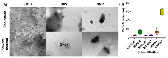 The particle size and morphology of MoS2 QDs are shown in Figure 3, where the size of the particle was analyzed by ImageJ®. Except for NMP under the solvent–thermal process, all samples showed particles of less than 20 nm. Among all solvents, ethanol effectively exfoliated bulk MoS2 to a few nanometers, whether by sonication or thermal treatment.