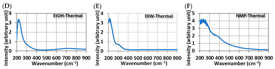 The UV-visible spectrum of MoS2 QDs was synthesized using different methods and solvents. Ultrasonically in (A) EtOH, (B) DIW, and (C) NMP; Thermally in (D) EtOH, (E) DIW, and (F) NMP.