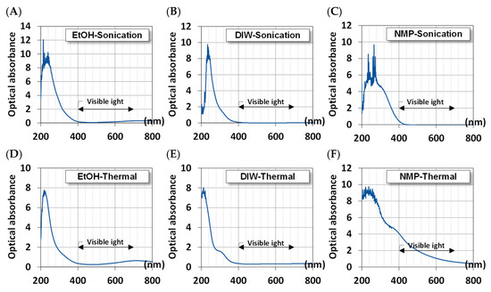The optical absorbance of synthesized MoS2 QDs using different methods and solvents. Ultrasonically in (A) EtOH, (B) DIW, and (C) NMP; Thermally in (D) EtOH, (E) DIW, and (F) NMP.