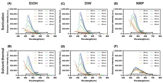 The photoluminescence spectrum of synthesized MoS2 QDs using different methods and solvents as marked. Ultrasonically in (A) EtOH, (B) DIW, and (C) NMP; Thermally in (D) EtOH, (E) DIW, and (F) NMP.