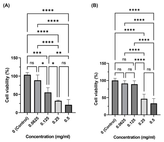 The biocompatibility of EtOH/ST MoS2 QDs at (A) 24 hr and (B) 72 hr. (p-value: ****: 0.0001%, ***: 0.001%, **: 0.01%, *: 0.05%, ns: not significant).