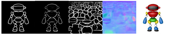 Three-dimensional (3D) character model (left to right: line draft, gray scale draft, UV map, normal map, front view).