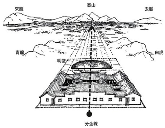 The Feng Shui Pattern of Antai Ancient House (source: Taipei Civil Affairs Bureau website). In the picture above: “案山” (An Shan) refers to the mountain or landform directly in front of a site in feng shui. 來龍 (Lai Long) refers to the flow of energy (or “chi”) that comes from the distant mountains or terrain and converges onto the site in question. 去脈 (Qu Mai) refers to the flow or pathway that energy (chi) follows as it leaves a location. It represents the continuation or dissipation of energy after it passes through the site. The “青龍” means the left side of a site or property when facing outward from the front of the location. The “白虎” represents the right side of a site or property when facing outward. This side is often kept lower than the “青龍” to maintain balance and avoid overbearing energy. The White Tiger is associated with yin energy and can represent protection and potential danger if unbalanced. “分金線” is a specific line used in feng shui to denote the precise alignment or division of space according to directions or energies. It plays a key role in determining the exact positioning of structures, entrances, or features on a property to ensure optimal energy flow and balance.