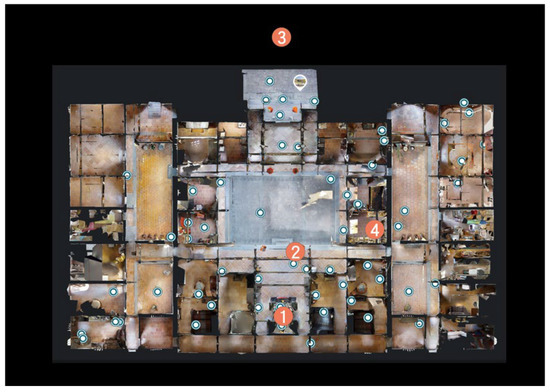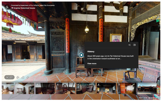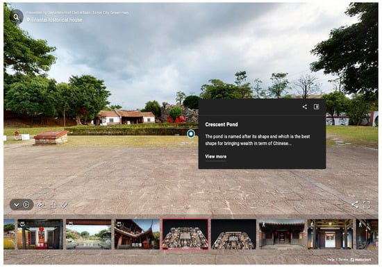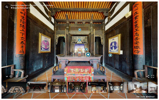 Using panoramic photography or video tours, visitors can explore natural attractions or cultural and historical monuments without the constraints of time or space. These tools do not require any wearable technology, allowing individuals to easily pursue their interests. Paired with explanatory narratives or audio commentaries of the scenic locations, visitors can understand the landscape’s features or its historical background. We distributed a questionnaire to participants who used a 360-degree panoramic photography online navigation system. This system was devised by the Taipei Civil Affairs Bureau to provide public access to browse classic cultural assets. The participants received instructions before navigating the “Taipei Lin An Tai Ancient House 360-degree Surround View Photography Guide System” at least for five minutes. We assessed user preferences for four designated stopping points from the entrance to the interior of the site. These points included the sacred table in the hall, the gateway to the main hall, the front yard outside the entrance, and the west wing. Each point featured multiple points of interest (POIs) to prompt user exploration. The navigation system’s appeal was assessed to users based on the breadth and depth of engagement from the ingress point. The 3D panoramic tour contents of the Lin Antai Ancient House were derived from the Taipei Civil Affairs Bureau website (Figure 8, Figure 9, Figure 10, Figure 11 and Figure 12).