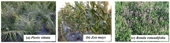 Field planting of test plants. (a) Pteris vittata L.; (b) Zea mays L.; and (c) Rotala rotundifolia.