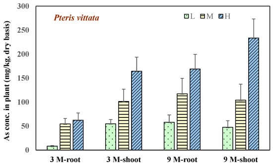 The arsenic content of the plants was measured at 3 and 9 months after planting and the results are shown in Figure 2. When Pteris vittata L. had grown for three months, the average arsenic concentrations in the underground tissues and shoots that were in the low-concentration area were 8.3 and 54.9 mg/kg; they were 54.6 and 101.5 mg/kg in the medium-concentration area and 62.2 and 164.4 mg/kg in the high-concentration area. After 9 months of growth, the average arsenic concentration in the underground tissues of Pteris vittata L. in the low-concentration area increased to 58.16 mg/kg, and the average arsenic concentration in the shoots was 47.5 mg/kg. The average concentrations of arsenic in the underground tissues and shoots in the medium-concentration area were 117.4 and 104.2 mg/kg, and they were 169.0 and 233.5 mg/kg in the high-concentration area. The analysis results showed that the average arsenic concentration in the underground tissues and shoots of Pteris vittata L. increased with increasing soil arsenic content. After 3 months, the arsenic content in the underground tissues of Pteris vittata L. continued to accumulate, but there were no significant differences in the accumulation of arsenic concentration in the shoots (at p < 0.05 by LSD test). Harvesting of aboveground tissues every 3 months after planting is therefore recommended.
