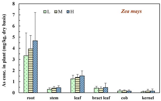 For corn, in various soil arsenic concentration test areas, the plant height and growth (total biomass) were measured when the plants were mature. The statistical results are shown in Table 3. The average height of plants in the high-concentration area was 224.1 ± 21.1 cm; in the medium-concentration area was 218.0 ± 29.4 cm; and in the low-concentration area was 217.0 ± 39.1 cm. As for the average growth of each plant, it was 530.8 ± 43.7 g in the high-concentration area; 510.7 ± 88.5 g in the medium-concentration area; and 538.7 ± 108.1 g in the low-concentration area. The proportion of biomass (dry basis) of each part of the maize plants was similar in different experimental areas. On average, roots accounted for 11.3%; stems accounted for 25%; leaves accounted for 11.2%; husks accounted for 11.9%; the corn cobs accounted for 11.6%; and corn kernels accounted for 28.4%. The average yield of corn kernels per plant in the high-concentration area was 143.4 ± 46.3 g; it was 127.4 ± 51.2 g in the medium-concentration area and 178.8 ± 57.0 g in the low-concentration area. The results of the LSD test (at p < 0.05) showed that within the range of soil arsenic concentration of 28.8–108.7 mg/kg (in this study), there were no significant differences in corn plant height, growth, and corn kernel yield among the experimental groups, indicating that the soil arsenic concentration did not inhibit the growth of maize within this range. The analysis results of arsenic concentration in various parts of the maize from various concentration areas are shown in Figure 3. The concentration distribution of arsenic in maize plants was highest in roots, with an average of 3.330–4.673 mg/kg, followed by leaves with an average of 1.252–1.519 mg/kg; stems and bracts had similar concentrations, with an average of 0.307–0.47 mg/kg and corn kernel concentration was the lowest, where the average dry basis arsenic concentration was between 0.083 and 0.162 mg/kg. The fresh weight concentration should be less than 1.0 mg/kg, which is in line with the human consumption limit standard stipulated in Taiwan. The average arsenic content in roots, stems, and leaves increased with the higher soil arsenic concentration. However, there was no consistent trend in bract leaves, corn cobs, and corn kernels.
