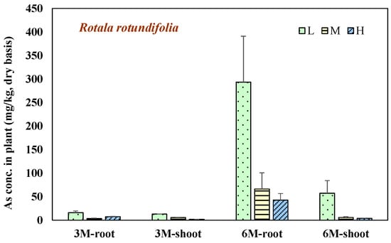 Arsenic is in a pentavalent form in aerated soil. The concentration of pentavalent arsenic in soil solution is very low (<1 μM) due to the strong adsorption of iron, manganese, and aluminum (hydroxide) oxides in soil and therefore reduces the bioavailability of arsenic in soil [22]. In anaerobic soils, arsenic is mainly in the trivalent form [23]. Soil immersed in water limits the transmission of oxygen, and due to the metabolism of facultative and anaerobic bacteria in the soil a reducing environment is created, resulting in the reductive dissolution of iron oxides and the release of arsenic into the soil solution. Aquatic environments enhance the bioavailability of arsenic in soil [24]. A variety of aquatic plants such as water hyacinths have a high absorption capacity for arsenic in water so can be used for arsenic removal in water [25]. Chen et al. pointed out that cattail had a strong tolerance to antimony and arsenic in slag, and the annual transfer amount of arsenic to cattail was 31.46 mg/m2; however, more than 98% of arsenic was accumulated in the root of cattail [26,27]. Lin et al. [28] studied the arsenic content of rice plants in the arsenic-rich area of the Guandu Plain in Taiwan. The average arsenic concentrations in roots, stems, and leaves of rice were 98.7, 3.49, and 0.074 mg/kg (dry weight), respectively. The arsenic content in the roots of rice accounted for about 96.8% of the whole plant, and that of the stems and leaves accounted for 3.1 and 0.1%. The cumulative concentration of arsenic in aquatic plants in roots was higher than that of stem and leaf. Rotala rotundifolia is an aquatic plant native to Taiwan. The studies pointed out that Rotala rotundifolia had a high translocation ability for arsenic, and the arsenic concentration in the stem and leaves reached 7822 mg/kg (dry weight). The lack of a translocation barrier in the root leads to a high accumulation concentration of arsenic in the stem and leaves [29].